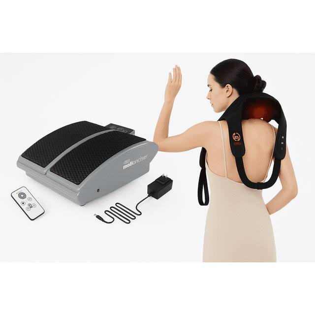 Experience full-body relaxation and pain relief with this powerful combo featuring the DR-HO’S MotionCiser Passive Motion Exerciser and the HENU Cordless Neck & Shoulder Massager with Heat. Perfect for those who spend long hours sitting or suffer from muscle tension and stiffness, this combo provides both leg circulation support and deep tissue massage therapy. The MotionCiser is a doctor-developed passive exerciser that gently moves your feet and legs to improve circulation, reduce stiffness, and relieve soreness. It’s ideal for seniors, desk workers, and anyone with limited mobility. The HENU Neck & Shoulder Massager features deep-kneading Shiatsu massage nodes and optional soothing heat to melt away stress and tension in your neck, shoulders, and upper back. Its cordless design and ergonomic straps make it perfect for use at home, in the office, or on the go.